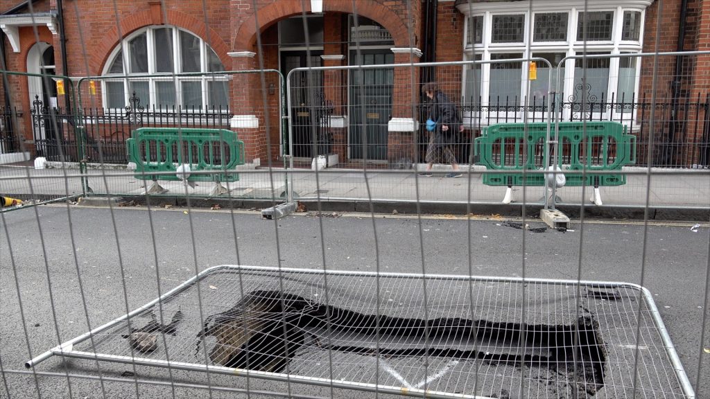 A large sink hole appears on Church Street in the affluent area of Kensington, London, UK. 07/02/2019.