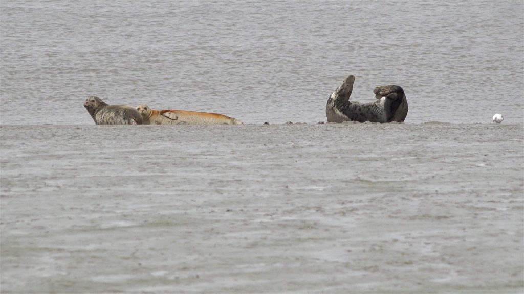 Two Harbour Seals (Common Seals) and a Grey Seal rest on the mud flats on the edge of the Thames estuary at Belvedere and Erith marshes, London, UK. 11/08/2019. (No audio)