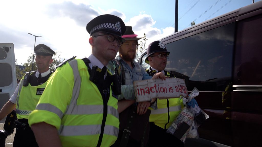 Police make two arrests after protestors perform a lock-on and block the road leading to the Excel Centre, where the Defence and Security Equipment International (DSEi) arms fair is due to be hosted the following week, London, UK. 08/09/2019.
