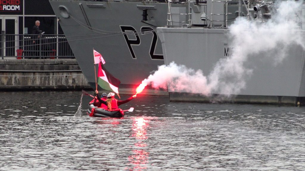 Activists breach security at the Defence and Security Equipment International (DSEi) arms fair by paddling a canoe across Victoria dock, setting off a flare and are intercepted by river police, London, UK. 10/09/2019.