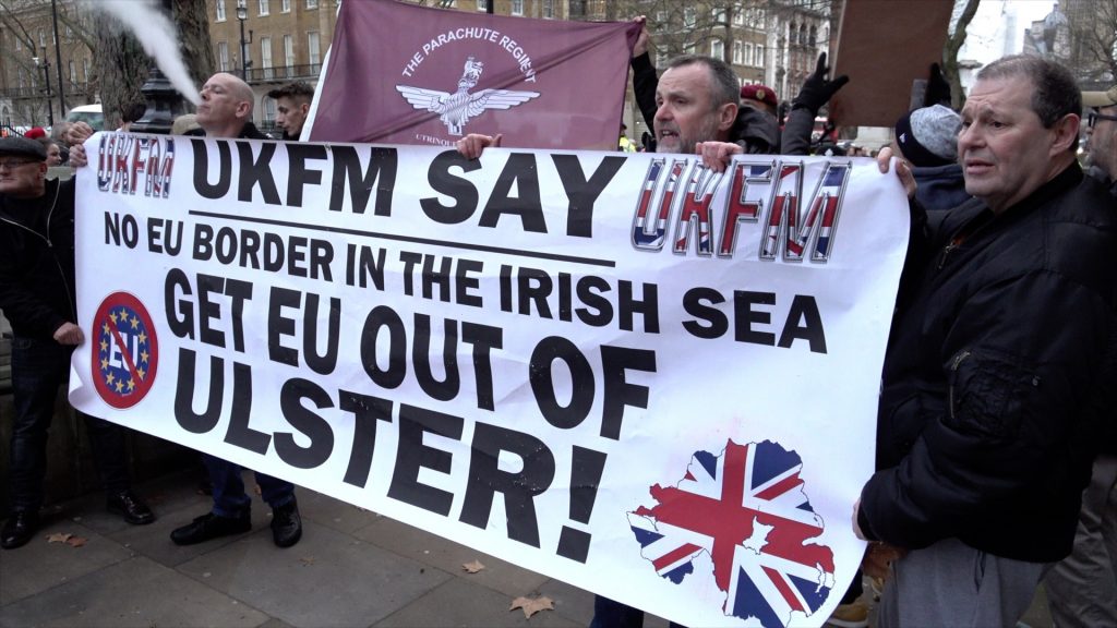 Police scuffle with UKFM pro-Brexit protestors while removing them from the sterile area outside Downing Street, London, UK.