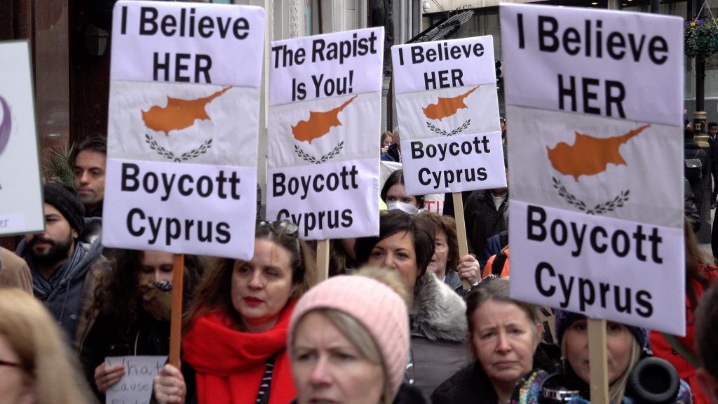 Protestors march from the Cypriot Embassy to Parliament Square in support of a British teenage woman and alleged victim of gang rape by 12 young Israeli men faces sentencing in Cyprus after being convicted of lying about the incident, London, UK. 06/01/2020.