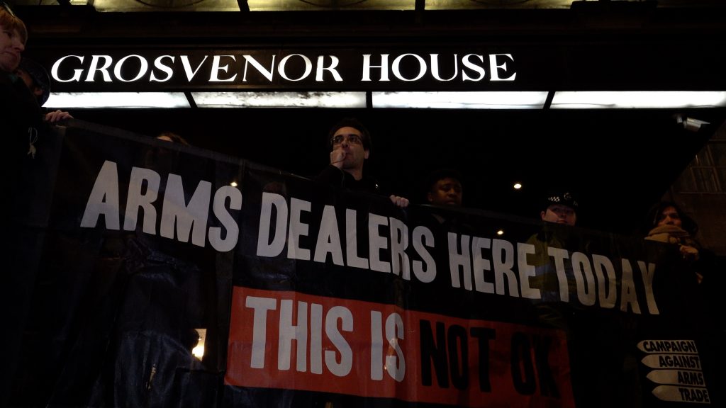 Anti-arms industry protestors block the entrance to the Grosvenor House Hotel as guests arrive for the annual Aerospace, Defence and Security dinner, London, UK. 22/01/2020.