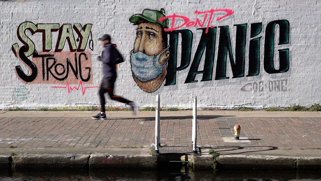 Two graffiti artists spray paint a character wearing a surgical face mask and the message “stay strong and don’t panic” on a wall and the finished graffiti is seen with people walking, running and cycling past after the public are told to enact social distancing to prevent the spread of Coronavirus, London, UK. 21-22/03/2020.