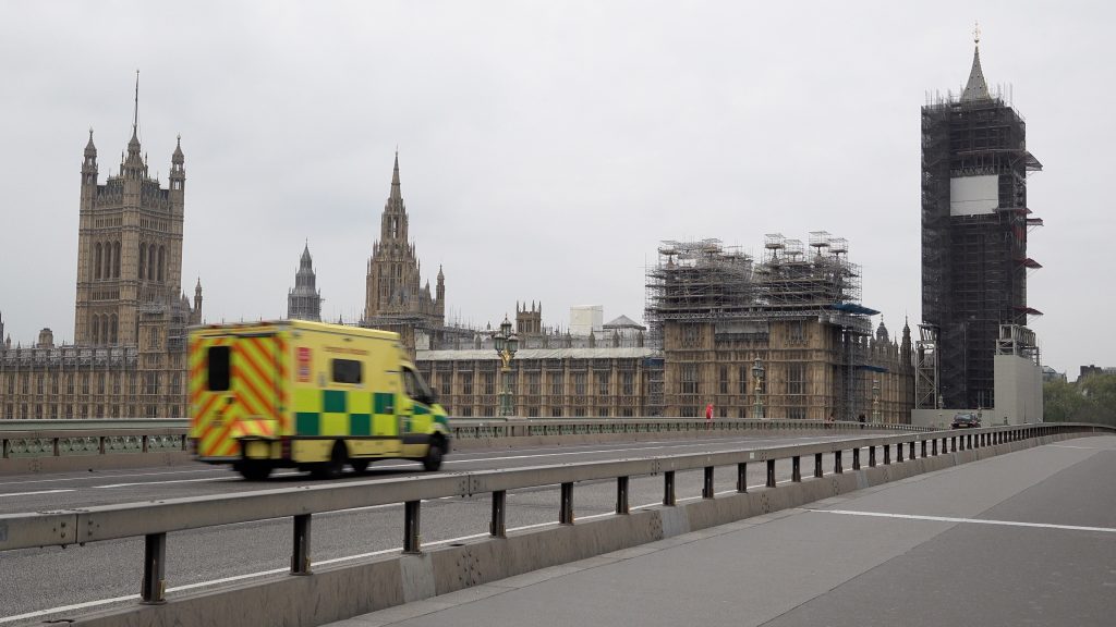 Ambulance and police vehicles and mounted police pass the Houses of Parliament and St Thomas’s hospital as they cross a near deserted Westminster Bridge during the Coronavirus outbreak, London, UK. 27/04/2020.