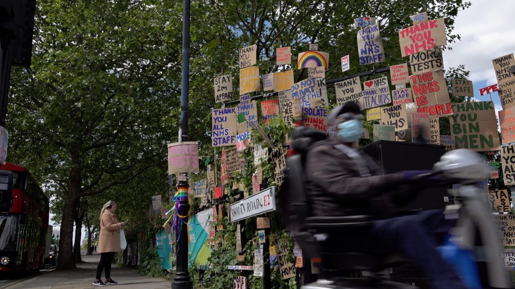A huge memorial wall of cardboard signs showing support of healthcare staff and all other key workers during the Coronavirus outbreak line the edge of a park in the East End, London, UK. 12/05/2020.