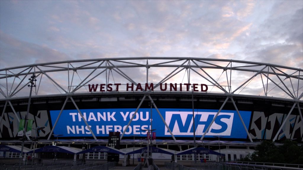 A time lapse of clouds passing over the Olympic Park Queen Elizabeth Stadium at sunset, where a giant billboard praises NHS healthcare workers and warns the public to maintain social distancing during the Coronavirus outbreak, London, UK. 12/05/2020.