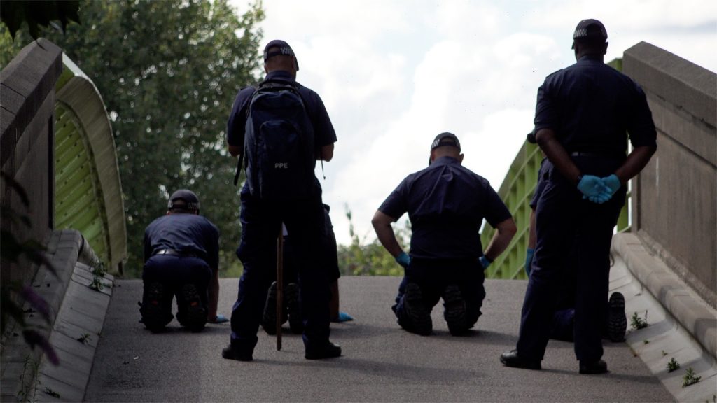 Police forensics search Mandeville Street bridge at Hackney Marshes following an incident early Saturday morning that left one man injured with a gun shot wounds and another with stab wounds, London, UK. 01/08/2020.