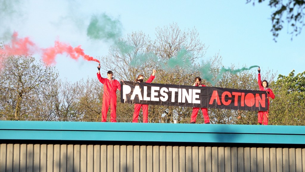 LEICESTER, ENGLAND – MAY 19: Palestine Action protestors occupy the rooftop an Elbit Systems drone factory, spray red paint across the building and set off smoke flares to highlight the Israeli arms company operations in the country on May 19, 2021 in Leicester, England.